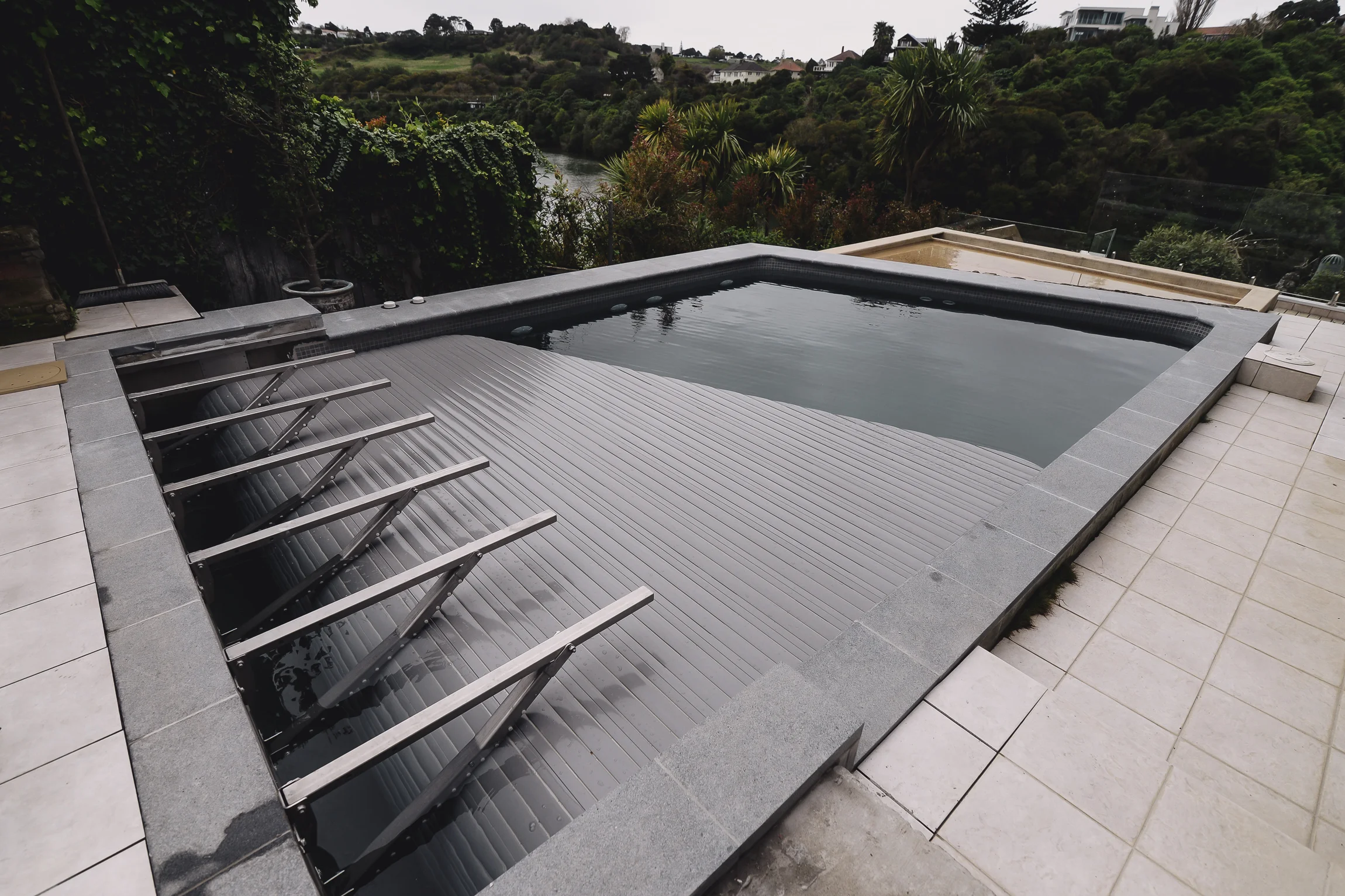 Construction of a new pool on an existing property. The function of a retractable pool cover sitting underneath the deck was complicated to construct but a very nice feature.