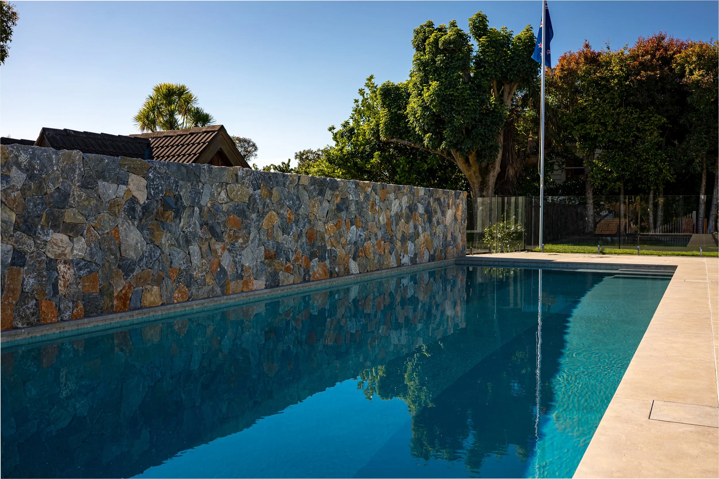 From an elevated site in Mt Eden, this pool is completely private. With a high stone wall providing privacy and also a stunning feature, this pool complements the beautiful renovation of this home.